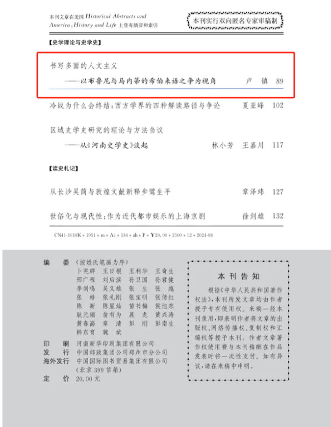 我院世界史学系副研究员卢镇撰写的《书写多面的人文主义——以布鲁尼与马内蒂的希伯来语之争为视角》一文在《史学月刊》2024年第8期正式发表。