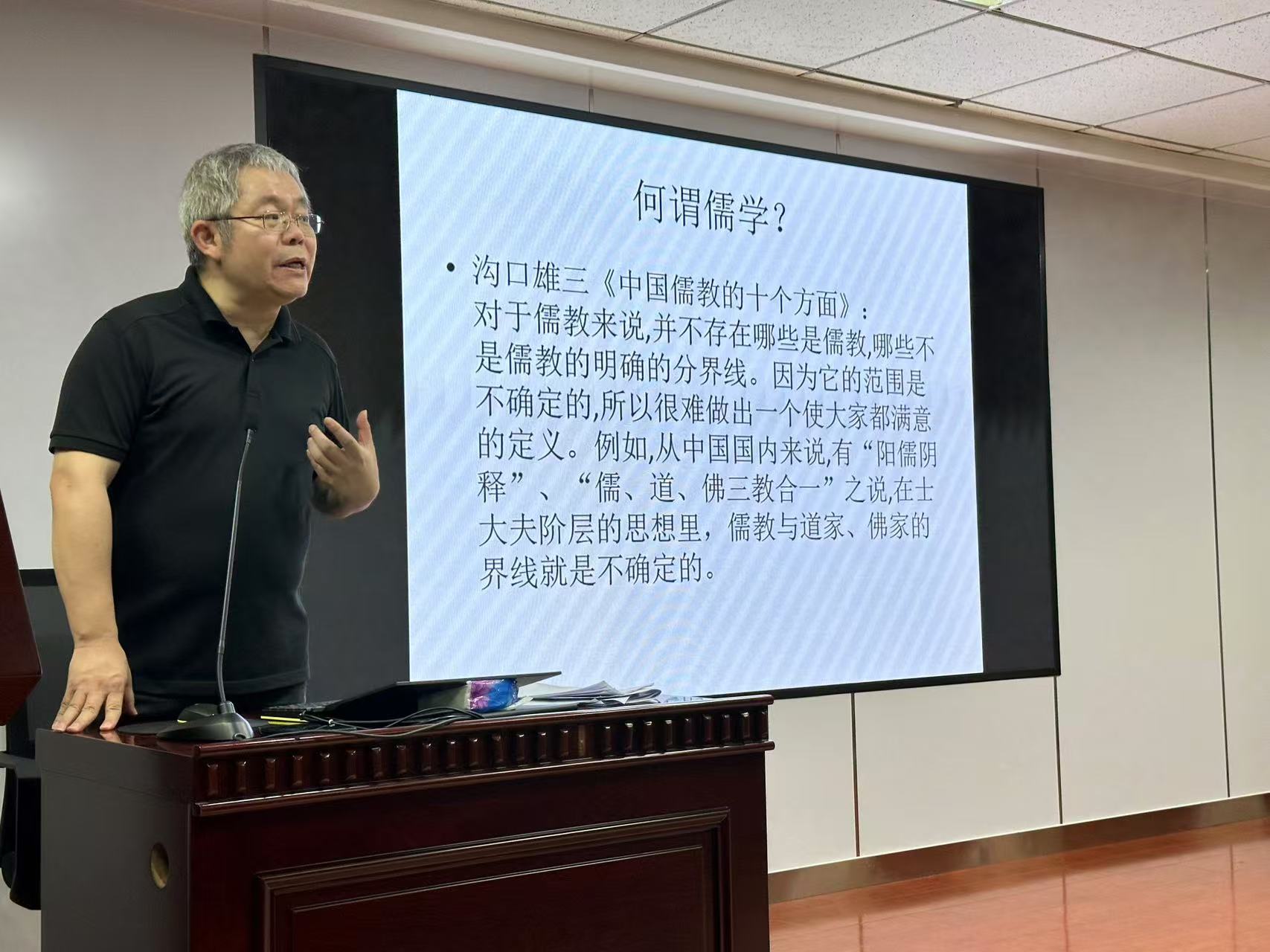 本次活动分为主题讲座以及学术交流两大环节。10月12日晚,首先是由北京大学历史系教授唐利国老师以“儒学与日本社会”为主题,于1017室向本学院学生进行主题讲座,由我院世界史学系胡炜权老师主持。