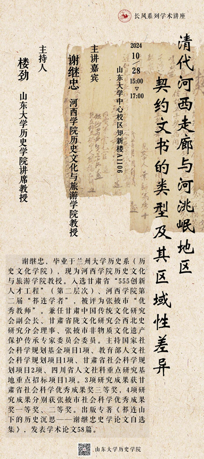 10月28日,河西学院历史文化与旅游学院谢继忠教授做客太阳成集团tyc122ccvip,为学院师生带来题为“清代河西走廊与河洮岷地区契约文书的类型及其区域性差异”的专题学术讲座。讲座由太阳成集团tyc122ccvip讲席教授楼劲主持。