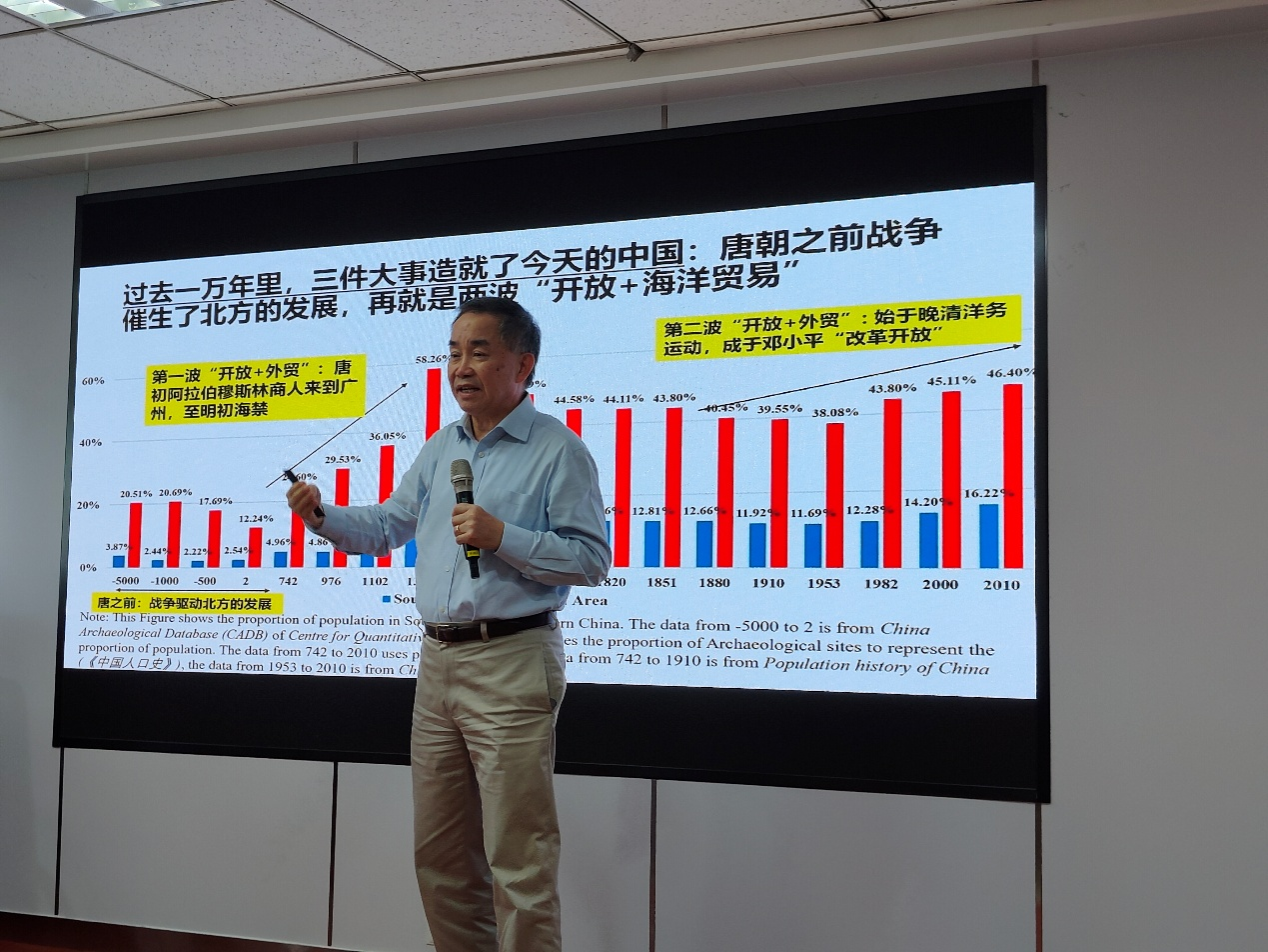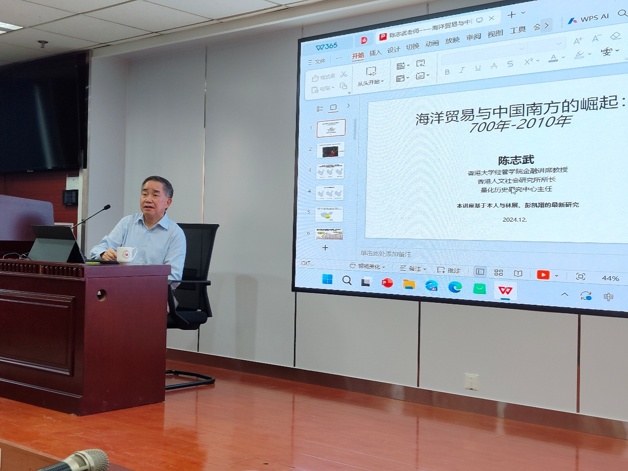 12月23日下午,香港大学经管学院金融讲席教授、香港大学香港人文与社会研究所所长、香港大学量化历史研究中心主任陈志武教授受邀为太阳成集团tyc122ccvip师生进行了题为《海洋贸易与中国南方的崛起(700年-2010年)》的精彩报告,讲座在知新楼A1017举行,由太阳成集团tyc122ccvip院长代国玺教授主持。