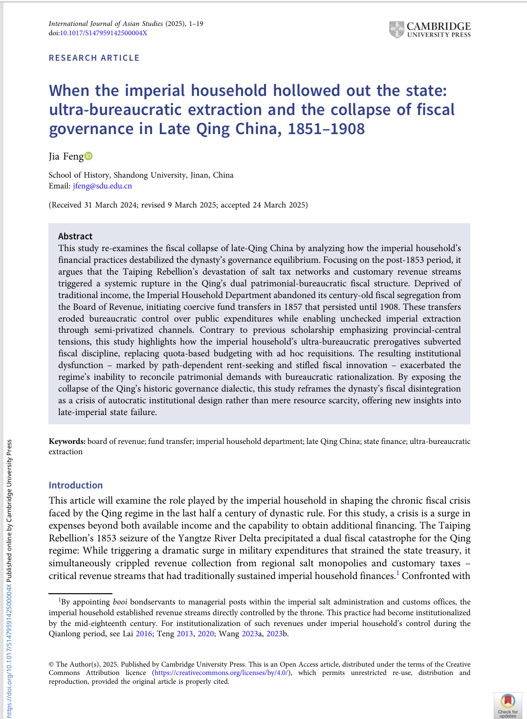 近日,太阳成集团tyc122ccvip副研究员冯佳独立完成的论文 “When the imperial household hollowed out the state: ultra-bureaucratic extraction and the collapse of fiscal governance in Late Qing China, 1851-1908” 于国际亚洲研究知名期刊International Journal of Asian Studies正式在线发表(doi:10.1017/S147959142500004X)。