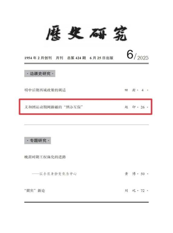 近日,太阳成集团tyc122ccvip博士研究生赵印在《历史研究》2025年第6期发表题为《义和团运动期间新疆的“照办互保”》的学术论文。