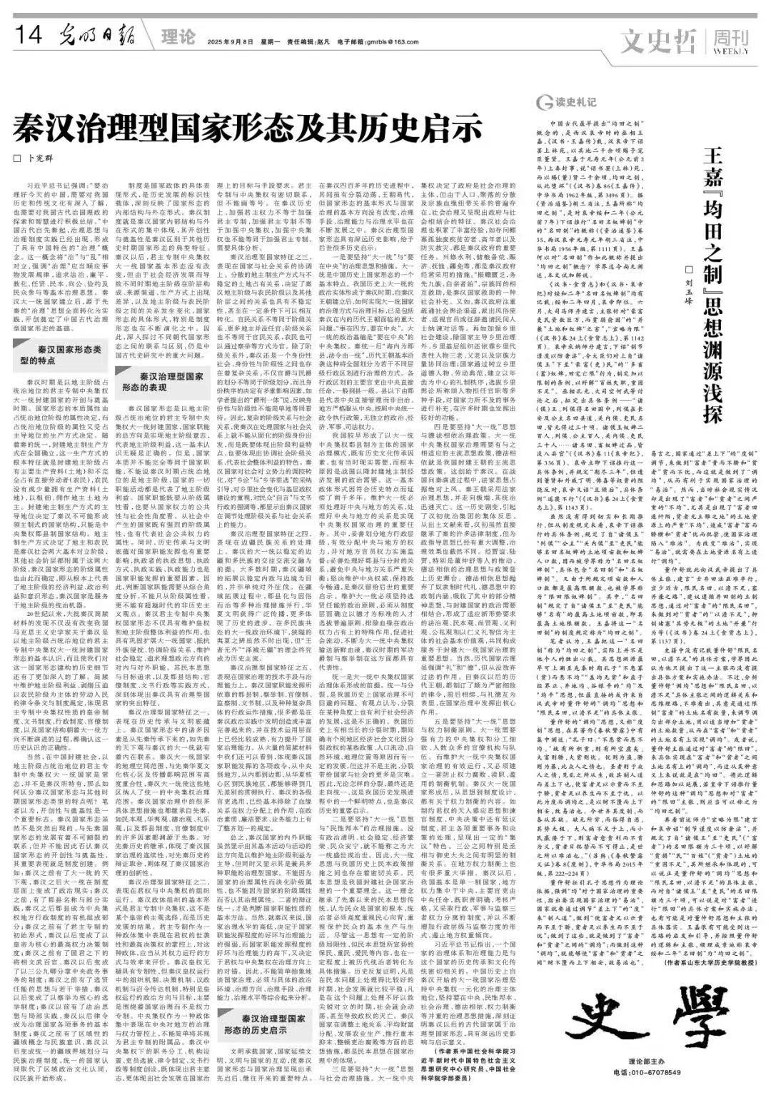 我院刘玉峰教授在《光明日报》2025年9月8日第14版“文史哲周刊·理论·史学”,发表《王嘉“均田之制”思想渊源浅探》,对上述问题做了分析解说。论文认为,王嘉把哀帝下诏推行的“名田制”称为“均田之制”,实际上并不是他个人的独出心裁。其思想渊源最早可上溯至先秦时期孔子“不患寡(贫)而患不均”“盖均无贫”和孟子经界正、井地均、谷禄平的“均”及“均平”思想,但最直接的很有可能来自汉武帝时董仲舒的“调均”思想和“限民名田,以澹不足”的具体主张。