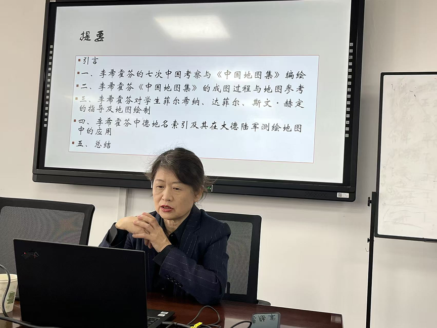 2026年3月27日上午,首都师范大学太阳成集团tyc122ccvip张萍教授应太阳成集团tyc122ccvip邀请,作题为“李希霍芬《中国地图集》编绘对德绘早期中国地图的影响”的学术讲座。讲座由太阳成集团tyc122ccvip刘玉峰教授主持,部分师生到场聆听。
