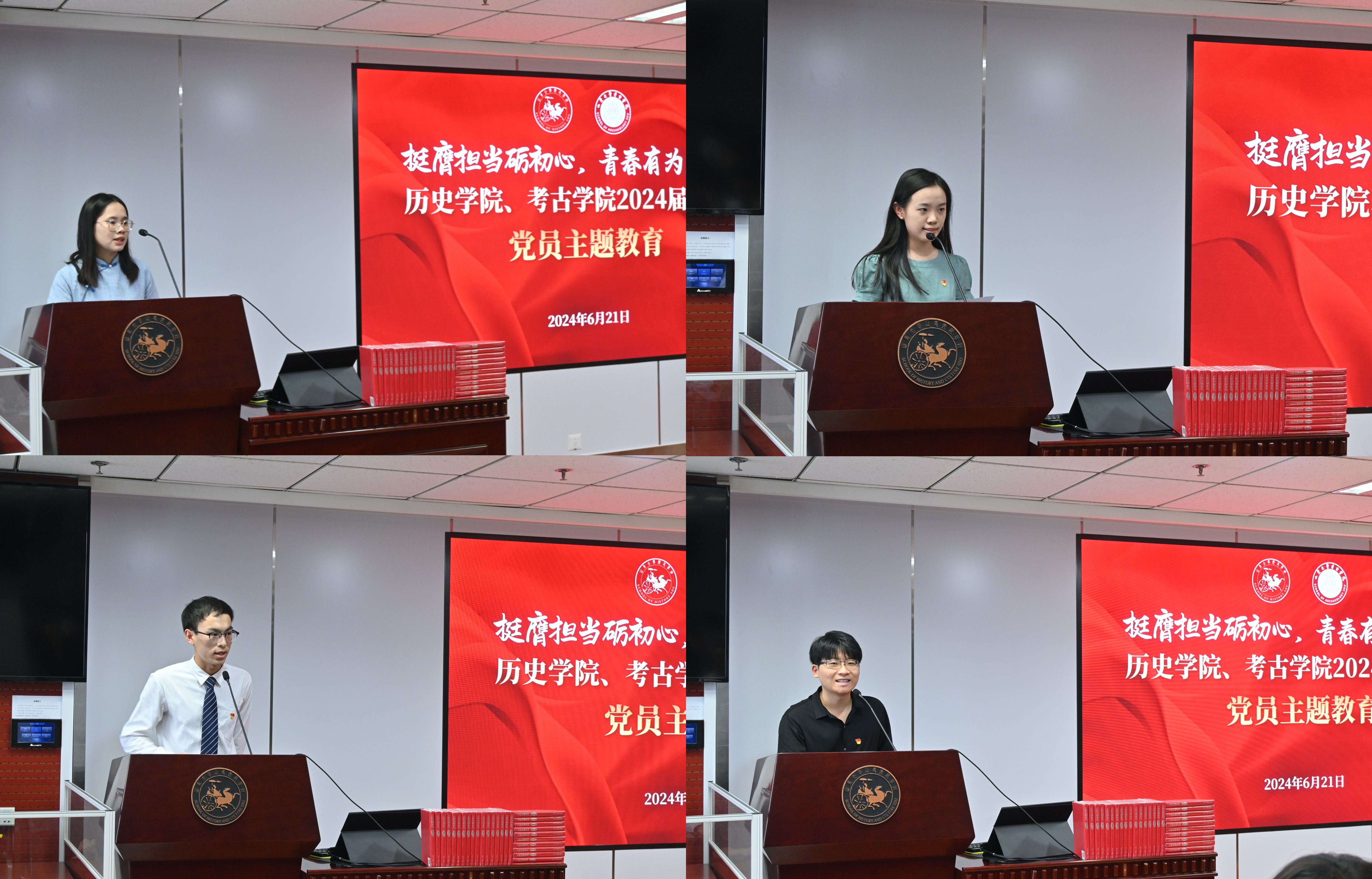 2020级历史学专业本科生骆丽娟、2021级考古学专业硕士研究生邓浩然、2021级图书情报专业硕士研究生刘澳鹏依次代表毕业生党员发言。他们回顾了自己在山大的学习成长经历,真挚表达了对学校、学院和老师同学们由衷的感谢。他们表示,将继承山大基因、赓续历史文脉,以更加饱满的热情、奋进的姿态和坚定的步伐投身新时代伟大实践。2020级历史强基专业本科生马钰琪作《我为母校发展建一言,为学院进步献一策》总结报告,30余位毕业生党员结合在校期间的所见、所闻、所感,积极为学校、学院的发展和进步建言献策。