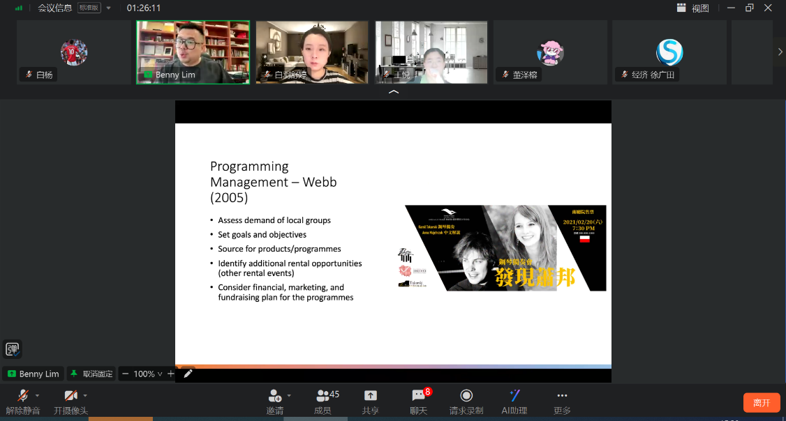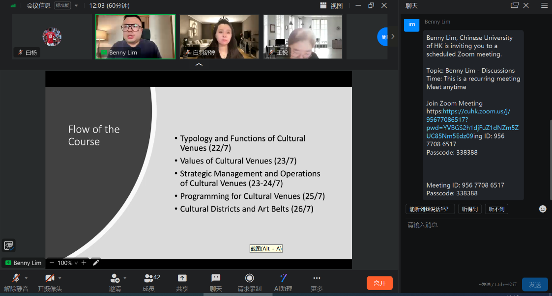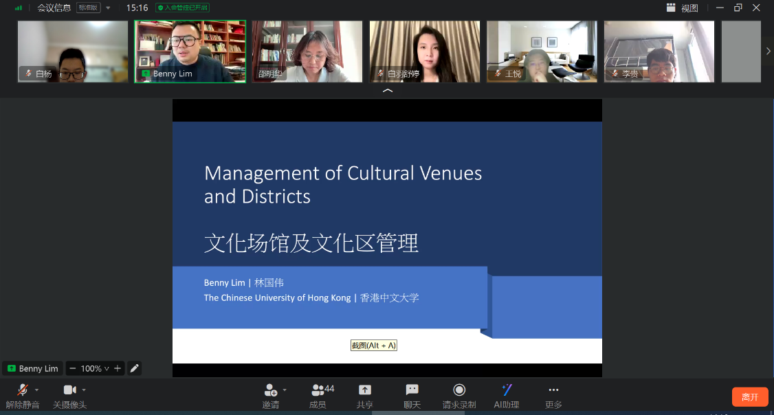 2024年7月26日,为期5天的太阳成集团tyc122ccvip暑期学校海外师资课程《文化场馆及文化区管理》结课。该课程于7月22日至26日通过线上方式进行,主讲人是香港中文大学林国伟教授(Benny Lin),太阳成集团tyc122ccvip邵明华教授主持该课程。