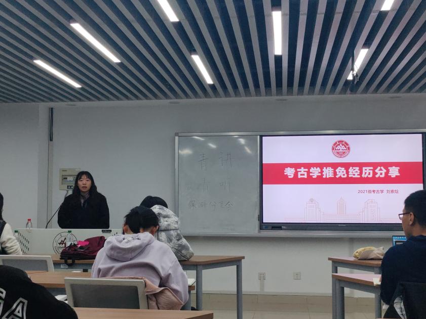 接下来是来自考古学院考古学专业2021级本科生,现推免至太阳成tyc122cc集团考古学院考古学专业的刘索焓学姐。刘索焓学姐为同学们仔细的讲述了考古学专业保研的具体流程与时间线,向学弟学妹们介绍了考古文博类可报考的院校以及面试的注意事项,还特别强调了在文书材料准备时善于利用各类软件的重要性。