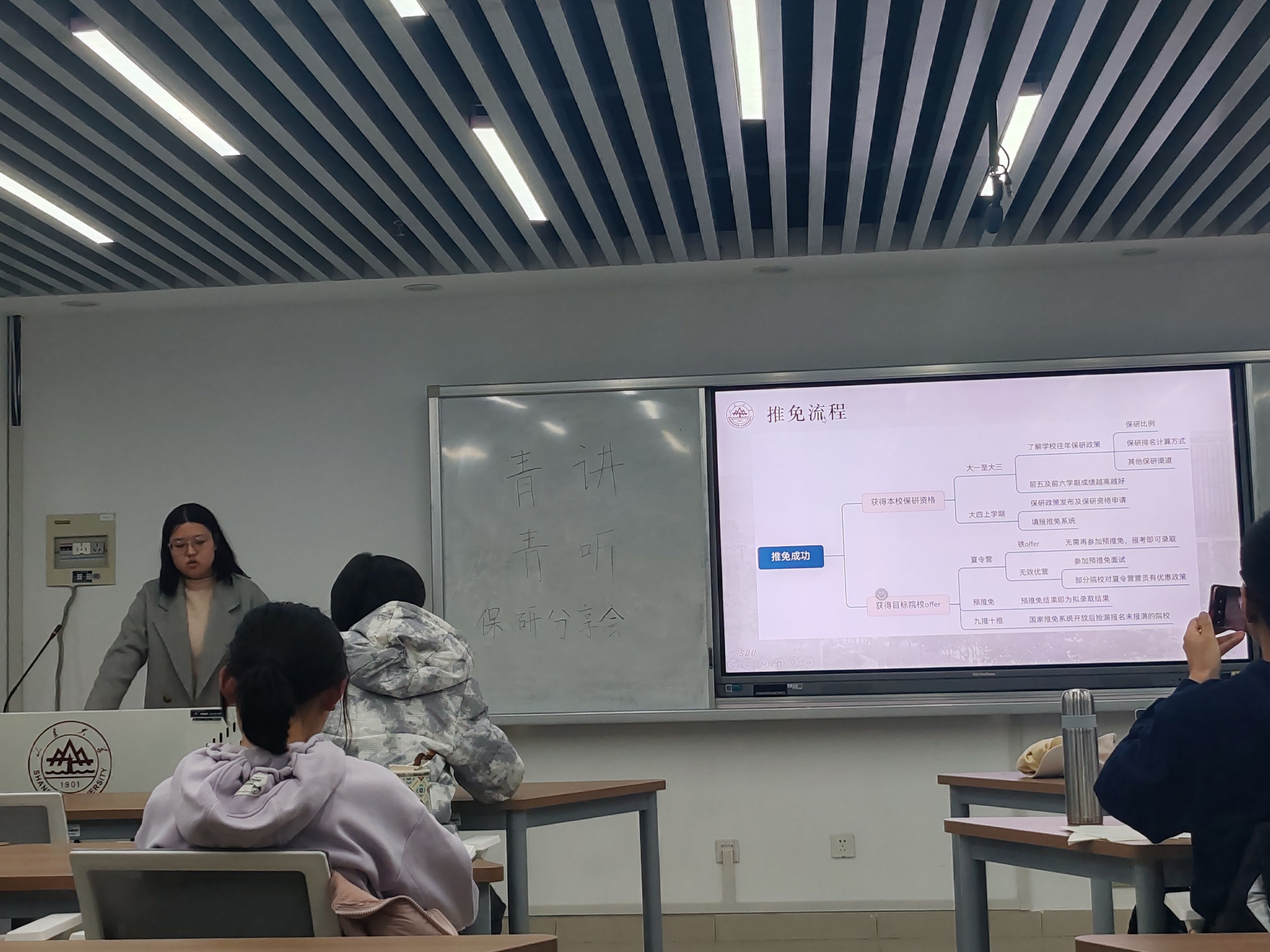 在几位优秀学长学姐分享后,便进入了提问交流环节,台下的学弟学妹们踊跃发言、积极提问,问题涉及保研的各个方面,包括但不限于申请策略、材料准备、面试技巧以及心态调整等。学长学姐们耐心细致地回答了每一个问题,分享了他们的亲身经历和独到见解,让在场的同学们受益匪浅。