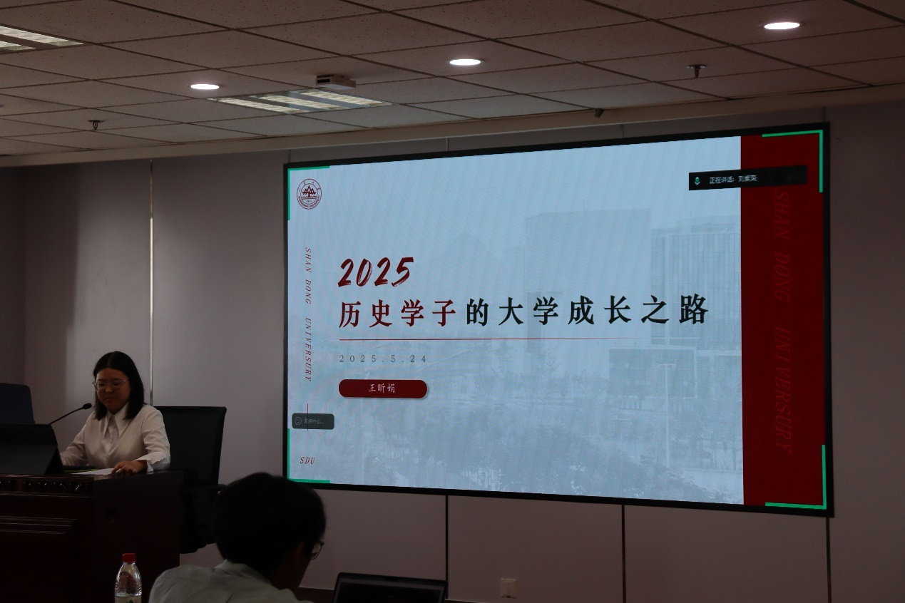 太阳成tyc122cc集团学生代表王昕娟同学则立足本校特色,以“历史学子的大学成长之路”为题,分享了课程学习与科研实践的双轨经验。在必修课与选修课协调中,她建议合理安排必修课与选修课选择,并分享了期末考试经验;阅读方面需“解构作者学术脉络,捕捉论点与史料的互动逻辑”。针对论文写作,她提出从模仿经典起步,在批判中创新,并推荐利用山东省图书馆等实体资源与学校电子数据库夯实史料根基。此外,她还介绍了学院内部学术刊物、大创项目等平台,鼓励本科生“不断尝试、拓宽兴趣,关注跨学科研究,保持探索世界的好奇”。