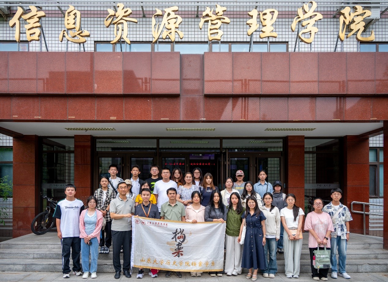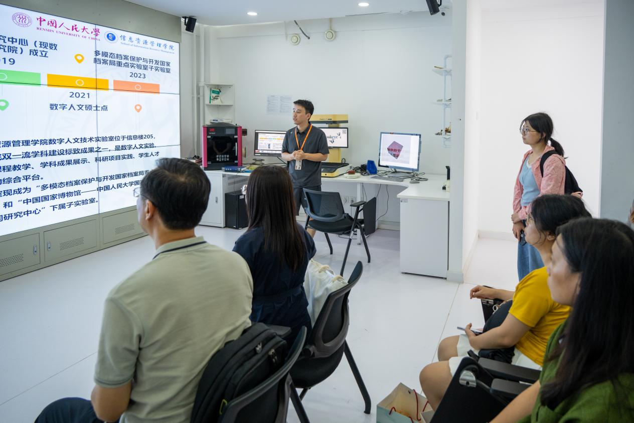8月26日下午,师生们来到中国人民大学信息资源管理学院参观学习。学院档案系系主任、电子文件管理研究中心执行主任钱毅教授对师生们的到来表示欢迎,并为师生们作主题为“基于五态四化的信息资源形态演进”的学术讲座。钱老师从档案资源的形态演变切入,简明生动地介绍了技术环境变迁下档案资源态别、管理空间、适用方法等要素的嬗变,为新时代发挥档案资源在证据留存、记忆建构、知识服务等多场景的利用价值提供了新的理论视角。在学院数字人文技术实验室刘力超老师的带领下,师生参观了实验室并了解相关历史沿革、技术设施、人才培养情况和最新科研成果,感悟数字人文技术赋能历史文化资源挖掘的现实魅力。
