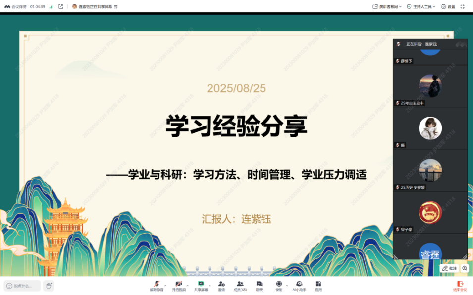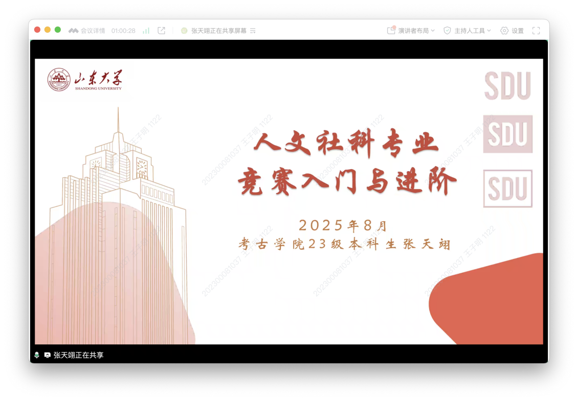 第二场分享会中,首届全国大学生新文科创新实践大赛金奖(冠军)项目负责人、考古学院2023级本科生张天翊围绕“人文社科专业竞赛入门与进阶”,从“参与竞赛的初心”“竞赛类别的选择”“竞赛入门的方法”等四方面对人文社科类竞赛与科研的基本情况进行了全面介绍,鼓励同学们结合专业特色、兴趣方向,积极参与科研竞赛,将课堂理论转化为研究能力,增强创新能力,提升综合素养。同时,她分享了信息获取、PPT制作、答辩准备等实用技巧,让同学们对科研竞赛有了更清晰的了解。