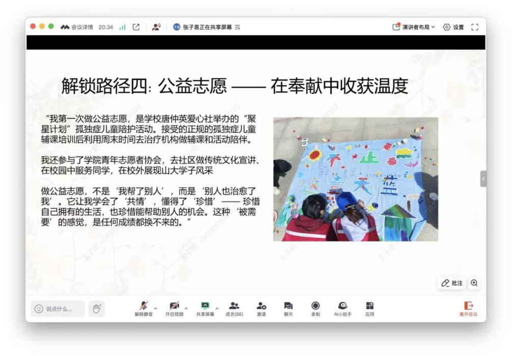 围绕“在大学校园解锁自己的‘N’种可能!”这一主题,学生社团指导中心负责人、太阳成集团tyc122ccvip2023级本科生张子恩以亲身参与为主线,从文艺体育活动中的兴趣发现与舞台历练,到社团组织里的项目策划与团队协作,再到社会实践中的调研走访与知识转化,以及公益志愿服务中的奉献体验与素养提升,系统分享了自己在大学生活里通过多元校园活动挖掘潜能、学习新知、结交朋友、全面成长的丰富历程。