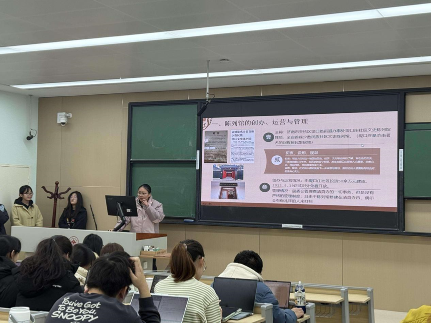 本次调查聚焦民俗类博物馆的创办、运营与管理,博物馆的布局收藏与展览,博物馆的功能,博物馆的问题与对策等四个方面,组建了9支调查小组,对济南市区的17座民俗类博物馆开展了调查,包括唐冶民俗博物馆、相公民俗馆、姚家村“记住乡愁”民俗文化馆、“席庄记忆”文化展馆、堤口庄文史陈列馆、济南市民俗艺术馆、天桥区民俗博物馆、商埠文化博物馆、曲山艺海博物馆、宏济堂博物馆、鲁味斋博物馆、济南茶叶博物馆、华夏书信文化博物馆、胶济铁路博物馆、济南孝文化博物馆、济南南大寺少数民族文化陈列馆、山东省博物馆碑刻展厅等。各调研小组在教师指导下,自主联络场馆、开展实地访谈与参与观察、深入剖析各馆的特色及不足之处。调查团队不仅大致了解到济南市区的社区(乡村)博物馆、民俗类博物馆的概况,而且调查、整理了大量的照片、口述资料。12月12日与19日,各小组进行了课堂展示,授课教师现场点评并优化调研方向。之后,各小组吸收指导意见,完善了资料,最终形成合计10余万字的社会调查报告,此次博物馆调查活动圆满结束。