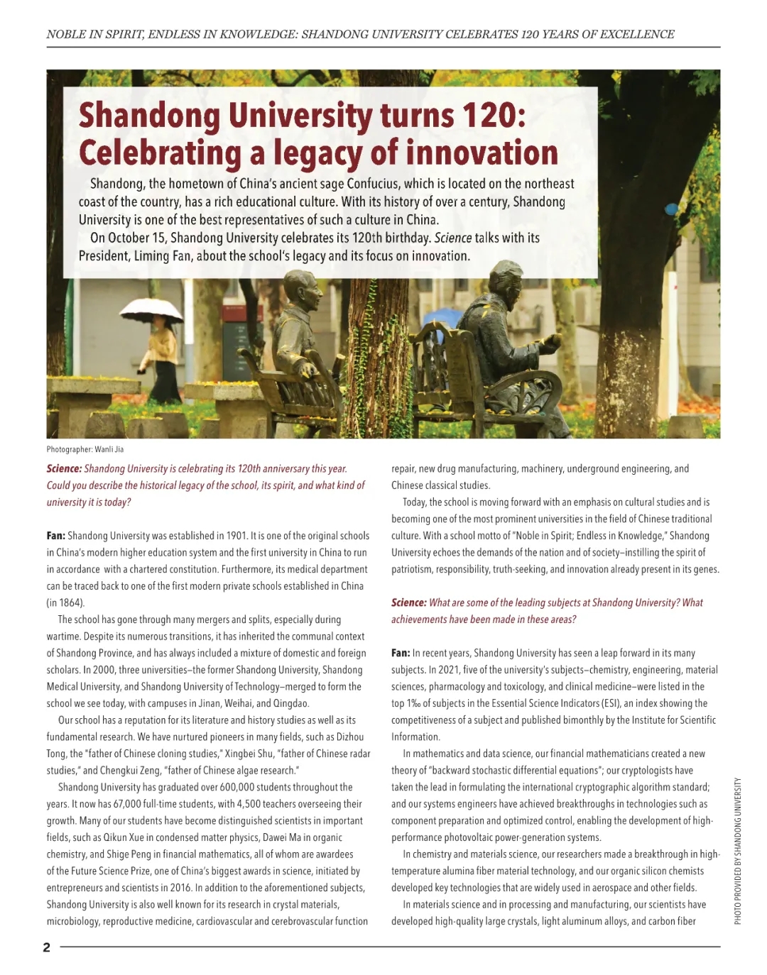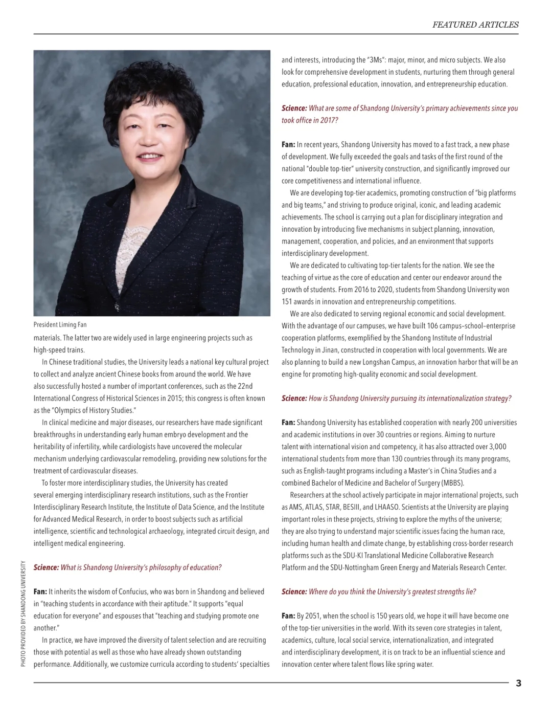 在Science专题访谈中,樊丽明校长以Shandong University turns 120: Celebrating a legacy of innovation为题,从学校的历史沿革、优势学科、教育理念、近年成就、国际化战略、发展蓝图六个方面,以问答形式向全球读者介绍了百廿山大的办学历程、突出成就和发展蓝图。