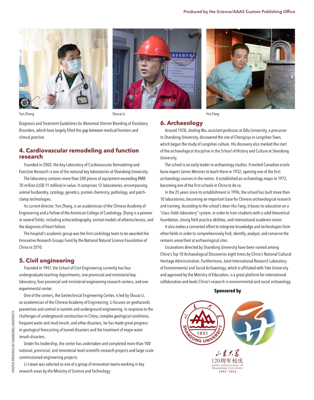 第四部分聚焦心血管病学研究,对其学科带头人张运院士及团队取得的一流成果进行了推介;第五部分报道了李术才院士如何带领岩土工程学科团队用技术创新攻克世界性技术难题;第六部分主题为考古特别是科技考古,介绍学科带头人方辉教授及团队如何借力国际合作和跨学科手段发展考古学科。