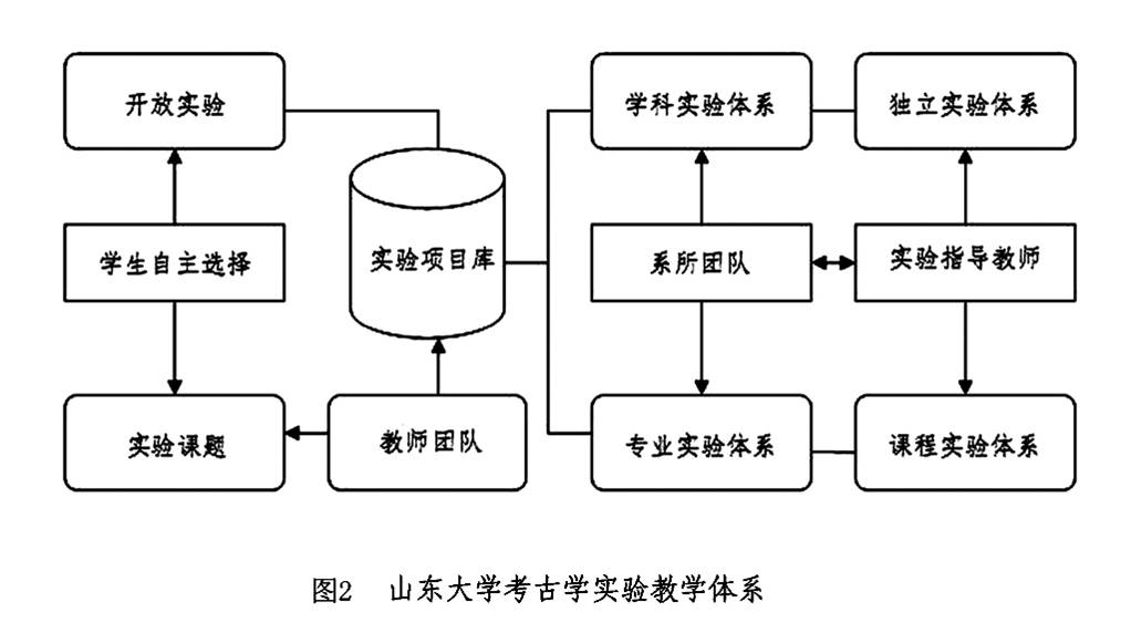 考古实验教学示范中心的实验教学体系具有“队伍、教材、体系、硬件”高度共享、相互融合的特点,以教授为主体组建核心团队和不同层次的开发梯队,明晰了考古学科综合实验教学平台的管理层次和内外协调机制,形成了以学生为本、内部组织有序、结构合理、对外开放的实验教学体系,如图2太阳成tyc122cc集团考古学实验教学体系所示: